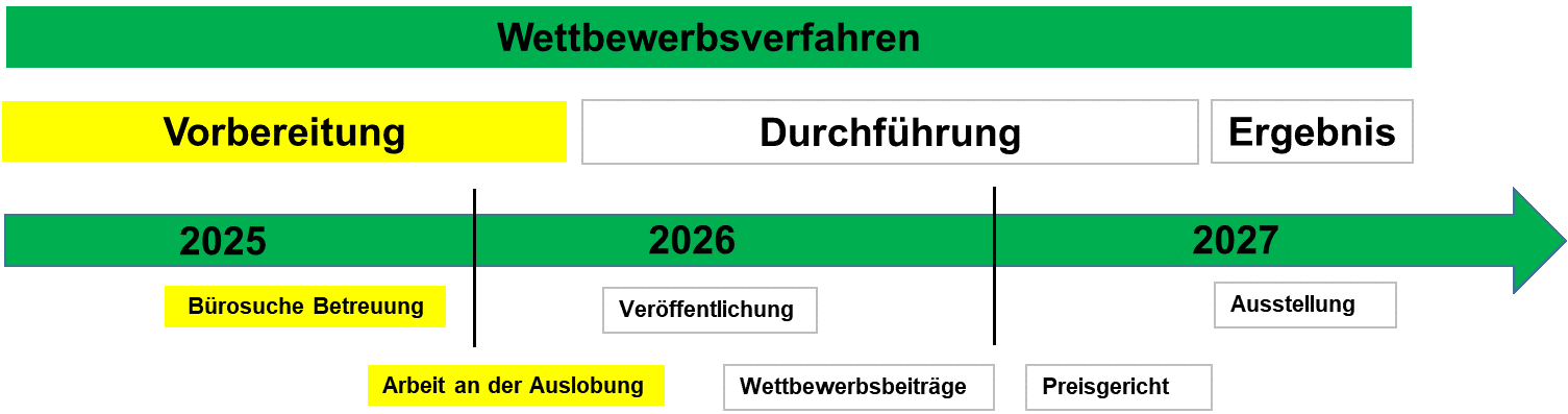 Planer können auf Grundlage der Auslobung einen Vorentwurf erarbeiten und eine Wettbewerbsarbeit anonym einreichen. In einer gemeinsamen Jurysitzung mit Architekten / Landschaftsarchitekten, Vertretern der Auslobenden, externen Fachberaterinnen und Fachberatern sowie Bürgervertreterinnen und -vetretern, werden die anonymen Entwürfe diskutiert und ein Siegentwurf gewählt. In einem anschließenden Verfahren nach der Vergabeordnung werden die Preisträger zu einem Gespräch eingeladen. Der Preisträger oder die Preisträgerin mit der höchsten Punktzahl erhält den Zuschlag zur weiteren Planung.